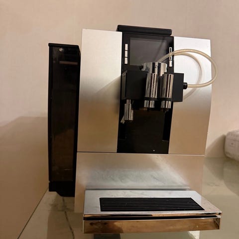 Säljer en vit Jura A7 kaffemaskin. Maskinen är designad för att brygga espresso, vanligt kaffe och andra lattevarianter. Man kan även välja varmt vatten för te.