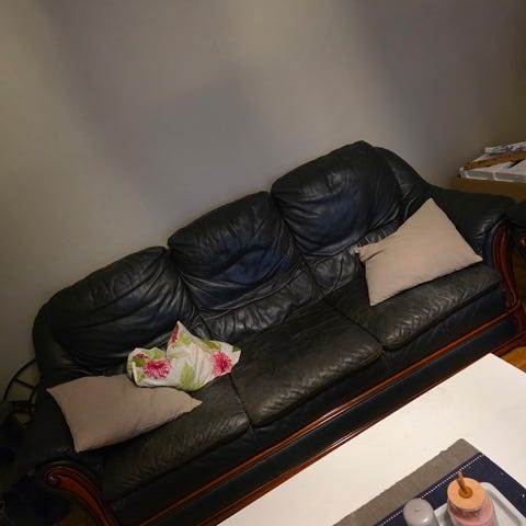 Skinnsoffa med divan bortskänkes mot avhämtning. Bredd 260cm, bredd på divan 200cm, djup 90cm