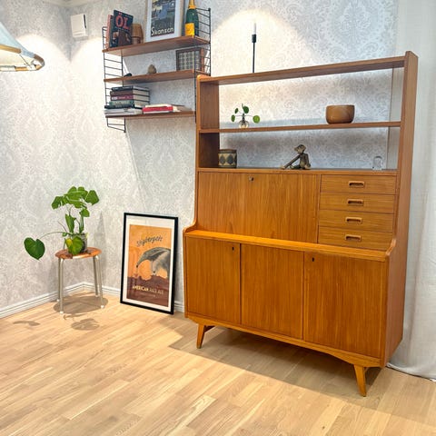 Sideboard /teakskåp med detaljer och benställning i ek
