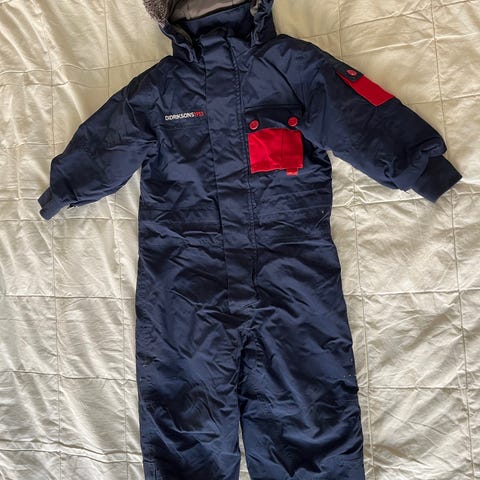 Didriksons overall i storlek 110 för barn, unisex. Tillverkad i polyamid (yttertyg och foder) och polyester (vaddering), med ett flerfärgat mönster.