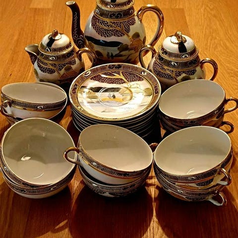 Säljer ett exklusivt och elegant orientaliskt serveringsset i guldtonad metall, i mycket fint skick och mest använt som prydnad. Setet är både praktiskt och dekorativt.