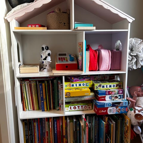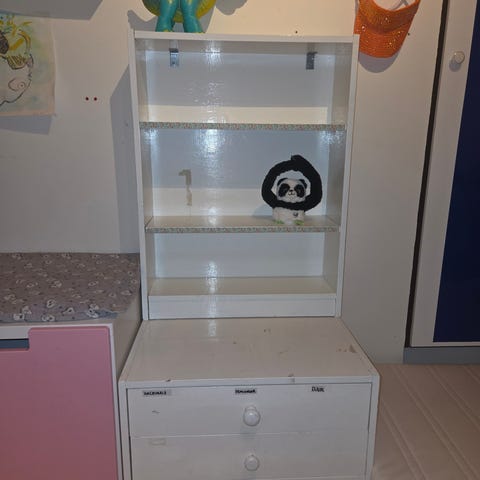 Billybokhylla från vårt ”barnrum”. Fin med rosa utsida.