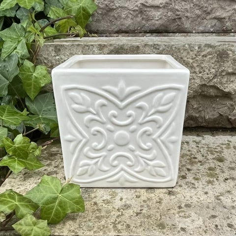 En fin keramik kruka med en brun/orange glasyr och vita ränder nära kanten.
