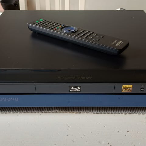 Panasonic SA-BTX75 Blu-ray-spelare med fjärrkontroll. Enhet för uppspelning av Blu-ray-skivor, svart färg, kompakt design för hemmabruk. Sickar med 2 säsonger av Simpsons.