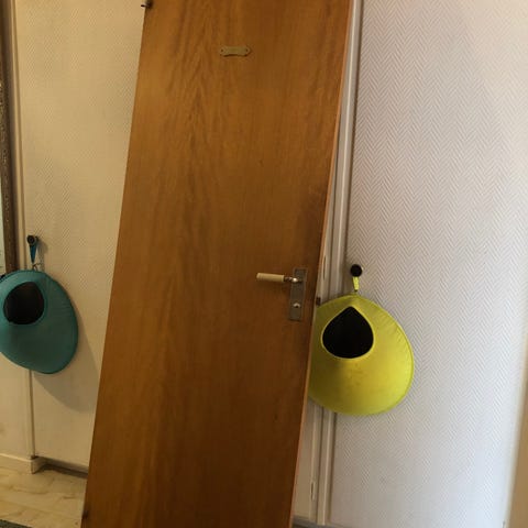 Två äldre trädörrar i olika storlekar och färger. En dörr är målad i beige och den andra i vit med slitage. Dörrarna är avsedda för inomhusbruk och kan användas för renoveringsprojekt. Den ena med karm är nyare, 9x21. Dörren 800x1930, 300.-/st