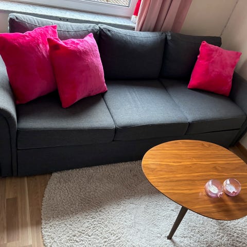 Äldre bäddsoffa där man kan dölja sängkläder i ryggen. Hål på tyget vid sitsen. Tung, så ta med bärhjälp.
