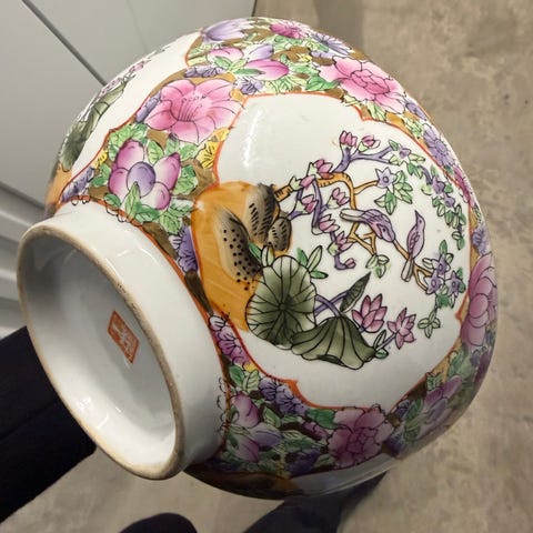Undersidan har en röd fyrkantig seal-mark, typisk för 1900-talets kinesiska exportporslin. Målningen gör varje exemplar unikt, och den fungerar lika fint som inredningsdetalj som för förvaring av småsaker.