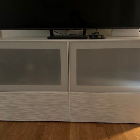 IKEA TV-bänk i vit färg med dörrar av frostat glas. Möbeln är designad för förvaring och placering av TV och medieutrustning. Den har en modern och enkel design som passar i vardagsrum.