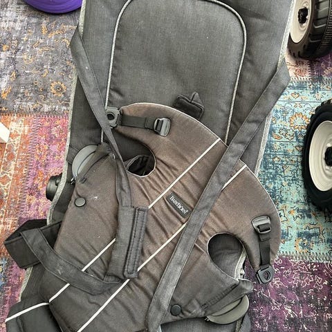 Bärsele Babybjörn med överdrag, bärstol, badbalja med badstöd, porta, amningskuddar 2x. Pris 200kr för allt. Tel 0704545463