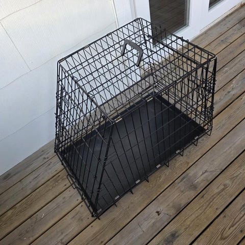 Metallbur för hund med svart färg och medföljande dyna. Burens konstruktion är i metallnät vilket ger god ventilation och insyn. Passar för hundar som behöver en säker och avgränsad plats inomhus.
