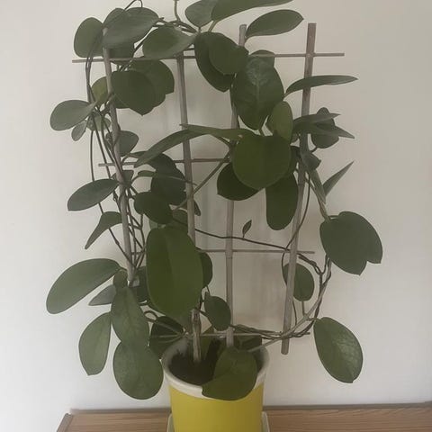 Hoya krukväxt med gröna blad. Växten är placerad i en svart kruka och är lämplig för inomhusbruk. Den trivs i ljusa fönsterområden och kräver måttlig vattning.