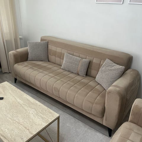 - soffgrupp med 3-sits soffa, 2-sits soffa och 1-sits soffa och en rund sittpuff. Sofforna är i mycket bra skick. Inga fläckar, sänkningar eller skador