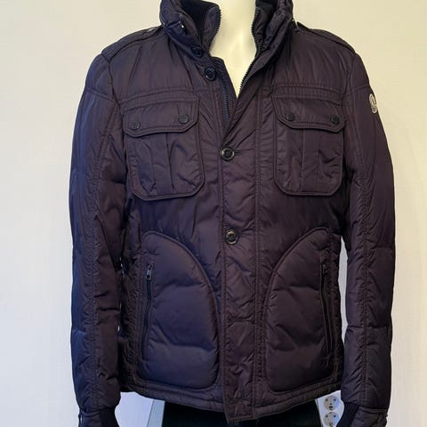 Klassisk modell i blå färg med Moncler-loggan på ärmen och original serietidnings-etiketten på insidan. Jackan är varm, lätt och perfekt för svensk vinter.
