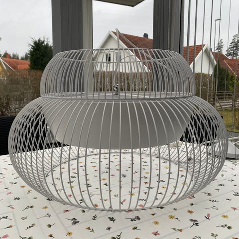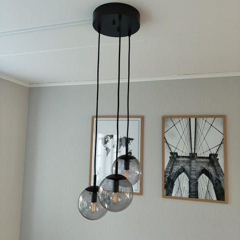 Elegant taklampa i metall med vita glaskupor i matt opalfinish. 3 st armar med glaskupor som fästs/lossas genom skruvfunktion, Glaskupornas diameter 20 cm. Totaldiameter nedtill 60 cm. Metallrör med möjlighet att justera höjd, max höjd för lampan 92 cm och min höjd 62 cm. Sockel 3xE27.