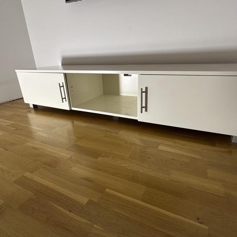 Hål för stereo på baksidan. Skåp med hyllplan i glas samt två lådor i trä.