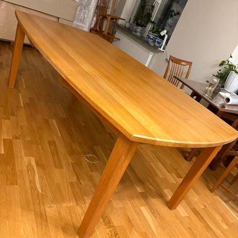 Det finns 5 st kompletta uppsättningar 4-or. finsnickeri, smed och sadelmakare har tillverkat dessa i Ek-topp med varmvalsad stålkant, rostfritt underrede med mässingsfötter och bänkar i rostfritt med Tärnsjö-läder. Bordstopparna är avtagbara och allt kan stuvas undan på betydligt mindre yta när dessa inte används. Totalt 20 platser För måtten se bifogade ritningar. Nypris totalt för 5 st 4or. inkl bord + underrede och 2 bänkar i Tärnsjöläder 100,000kr. Paketpris vid köp av samtliga bord och bänkar om totalt 20 plaster 32,000kr
