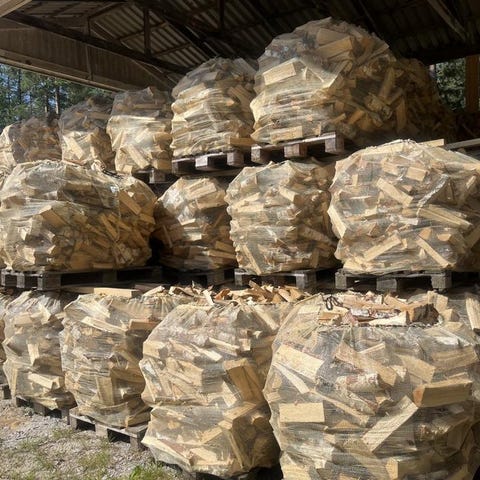 Björkved på pall 1 kbm nätsäck löst, ca 0,8 fast. Längd 25 cm väl kluven. Lastning ingår.