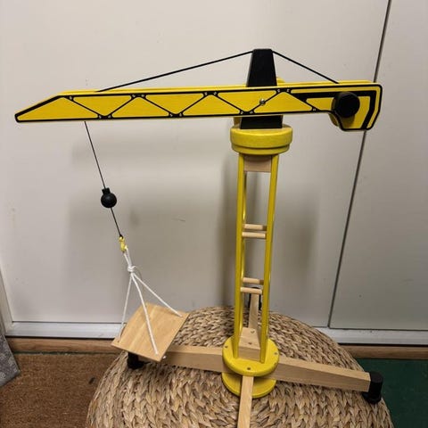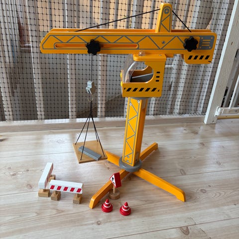Viga Träkran leksak tillverkad i trä med en grön arm och naturfärgat trä. Leksaken har en snöre och en krok för att lyfta och flytta små föremål. Passar för barn och kan användas för lek och utveckling av motoriska färdigheter.