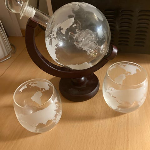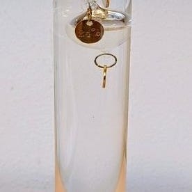 Galileo termometer, förseglad glascylinder som innehåller en klar vätska och flera glasbehållare med varierande densitet.