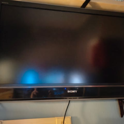 Panasonic TV med fjärrkontroll. Svart färg och standardstorlek. Utrustad med flera anslutningar på baksidan för externa enheter.