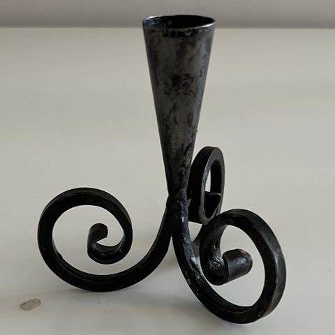 Vi har två av dem så vi säljer en oanvänd vackert dekorerad ljushållare av svart metall för blockljus. Den står på tre stadiga fötter och har en fästpinne i centrum för att hålla ljuset ordentligt på plats. Passar att skapa varm stämning hemma eller vid graven. ( Se 3 bilder. Klicka / Tryck på bilderna så ser du dem större och bättre )