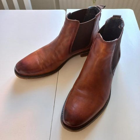 Bugatti finskor i mörkt läder med vissa designdetaljer. Jag har inte använt dem på länge då den ena klacken åkt av och jag har inte orkat fixa det. Gummit under klacken på den högra är alltså borta och träet som det ska sitta på bör bytas också (syns på bild). Lämnar det åt händig. Innersulan kan också bytas då den är synligt använd men fungerar.