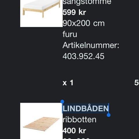 IKEA-säng (NEIDEN) 90x200 cm + ribbotten (LURÖY) 90x200 cm.