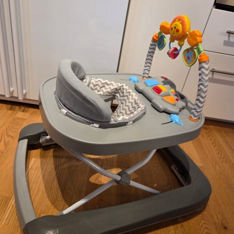 När barnet blir större kan mattan enkelt tas bort och hjulen fällas ner så att stolen fungerar som en klassisk gåstol. Den medföljande lekpanelen med ljus och ljud är en rolig detalj som även kan tas loss och användas separat för variation i leken.