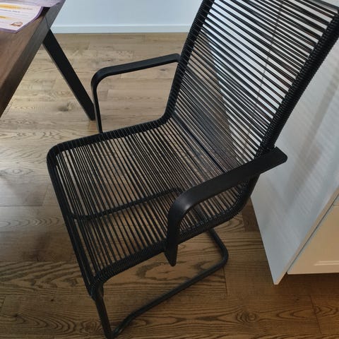 Utemöbelset bestående av ett runt bord med grå bordsskiva och svarta ben samt flera svarta stolar med armstöd och flätad design. Passar för utomhusbruk.