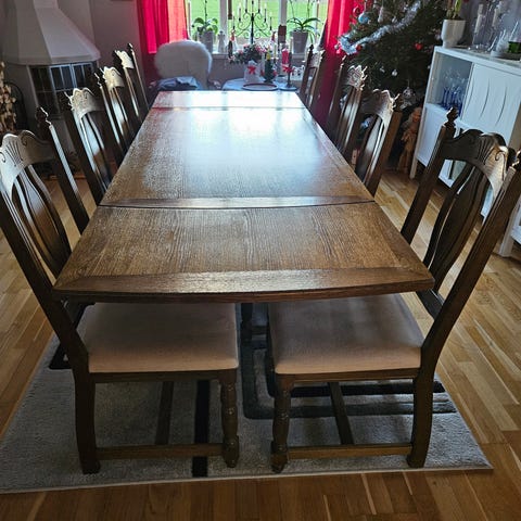 4 sköna stolar i vitt konstläder ingår, en har skav men andra i fint skick