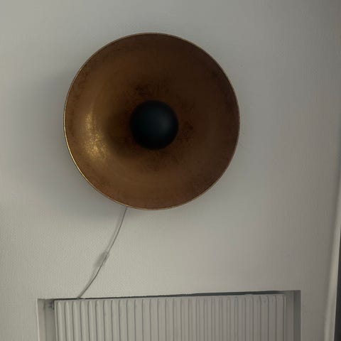Captain vägglampa. Metall med svart utsida och guldig insida som sprider ett varmt och mjukt sken.