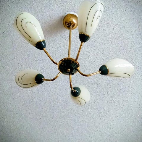 Komplett med prismor i fint skick. Beige/naturvita skärmar från Watt & Veke (defekta men det syns inte även om lampan är tänd)