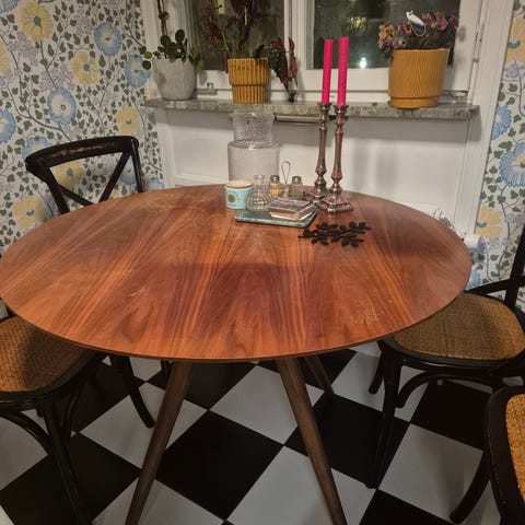 Snyggt och stabilt runt matbord i gott skick. Bordet rymmer 4 personer bekvämt.