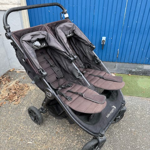 Baby Jogger Dubbel barnvagn i svart färg. Barnvagnen är designad för två barn och har sittplatser med säkerhetsbälten. Den är utrustad med hjul för enkel manövrering och har en robust ram.