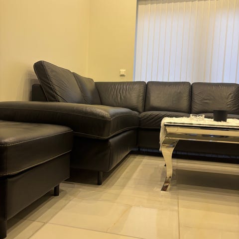 Hörnsoffa och soffbord från Mio. Varsamt används. En kedja på soffan behöver lagas. För mått skicka meddelande.
