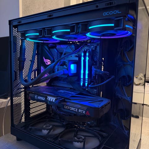 MSI Gaming Dator i vit färg. Datorn har ett genomskinligt sidopanel och är utrustad med moderna anslutningar och kylsystem. Designad för spel och hög prestanda.