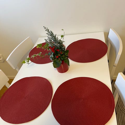Säljer 10 st runda silverglittrande bordstabletter samt ett matchande vinflaskefodral i samma stil.