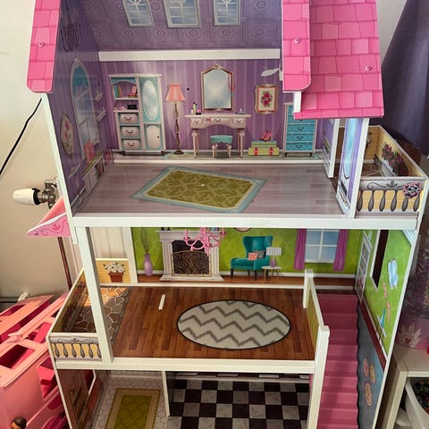 Dockhus i trä med flera våningar. Fasaden är rosa med fönsterdetaljer och en dörr. Passar för lek och inredning med små möbler och dockor. Perfekt för Kreativ Lek! Säljer ett gulligt dockhus i trä som bjuder in till många timmars fantasifull lek. Huset har flera våningar och rum, redo att inredas och bebos av barnens favoritleksaker. Egenskaper: Typ: Dockhus Material: Trä Antal våningar: 3 våningar med hiss Rum: ett vardagsrum och ett sovrum kök Detaljer: en trappa mellan våningarna", "fönster", "dekorationer på väggarna redo för nya äventyr. Detta dockhus är en underbar leksak som stimulerar barns kreativitet, språkutveckling och sociala färdigheter genom rollek. Finns i: Hallunda