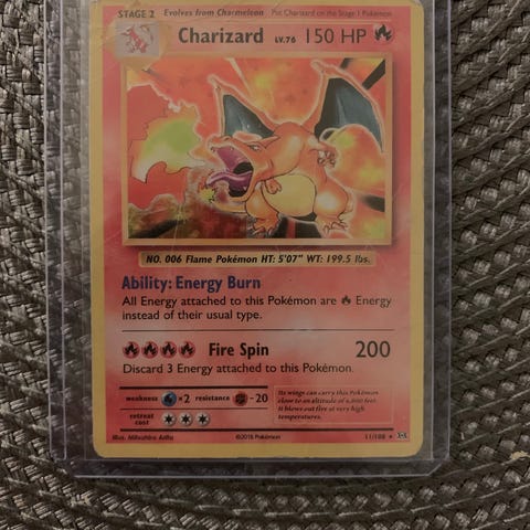 Pokémon Charizard GX samlarkort med holografisk design. Kortet visar Charizard med 250 HP och inkluderar attacker som Alldagsattack, Flammande Kanon och Energi GX. Kortet är avsett för samling och spel.
