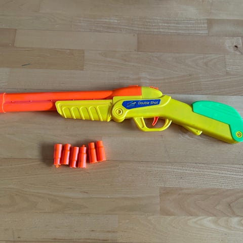 Två Nerf, ett av okänt märke och ett hagelgevär med patroner som hoppar ut när man öppnas bössan.