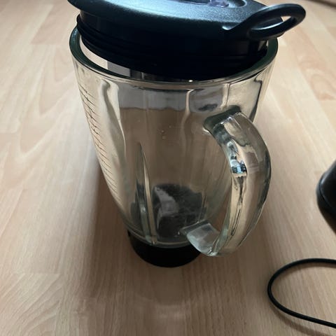 Wilfa Blender med glasbehållare. Blendern har en metallbas med vred för hastighetsinställning och en glasbehållare med måttangivelser. Produkten är avsedd för att mixa och blanda ingredienser.