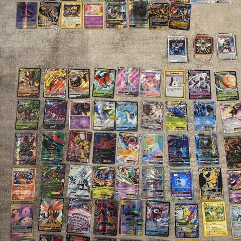 Pokémon Trading Card Game samling bestående av olika samlarkort. Korten är organiserade i plastfickor i ett samlaralbum och inkluderar flera olika Pokémon-figurer och varianter.
