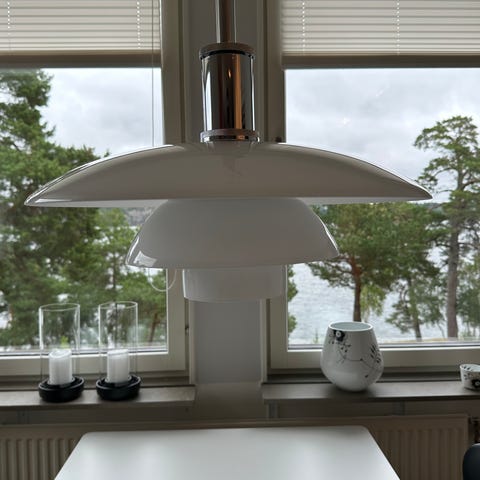 PH 5 pendel monokrom från danska Louis Poulsen är en ikonisk taklampa tillverkad av aluminium. Ordet monokrom i pendelns namn kommer från att både skärmarnas ovansida och stagen är helt enfärgade. Lampan avger ett helt bländfritt ljus, vilket gör att den passar utmärkt som belysning över både matbordet och soffbordet. Taklampan avger ljus både nedåt och åt sidorna, vilket gör att den på så sätt belyser sig själv. Takpendeln är formgiven av Poul Henningsen med tre skärmar som i huvudsak riktar ljuset nedåt tillsammans med ytterligare en skärm med ett trumpetliknande utseende i toppen som ger belysning av området ovanför de tre understa skärmarna. Det ikoniska treskärmssystemet formgavs 1925-1926 då Henningsen i ett samarbete med Louis Poulsen ritade de första PH-lamporna inför en utställning i Paris. Vid formgivningen använde han sig av ett vetenskapligt perspektiv då lampan är uppbyggd utifrån den logaritmiska spiralen, en matematisk spiralkurva som förekommer på många ställen i naturen. Detta ger en jämn fördelning över skärmens hela kurva