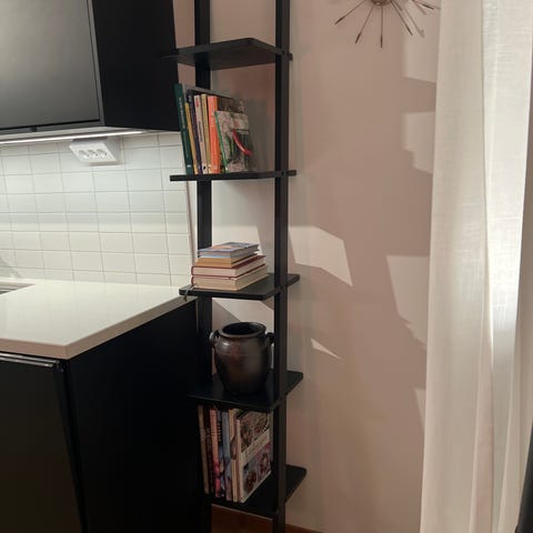 Steghylla som hängs på väggen. Skruvar medföljer. Väldigt fint skick, enda är en liten flaga färg som saknas på hyllkanten högst upp.