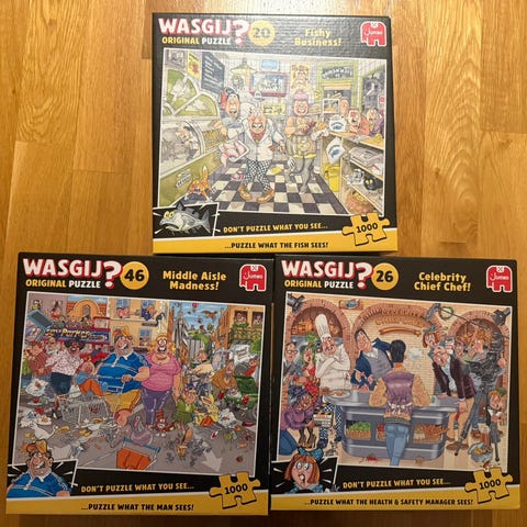 Sex stycken pussel säljes eller byters. Tre Jan van Hasteren och tre stycken Wasgij