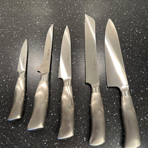 Aarikka köksknivar i olika färger med plasthandtag. Setet innehåller knivar med handtag i gul, grön, orange och blå färg. Knivbladen är av metall. Passar för allmän användning i köket.