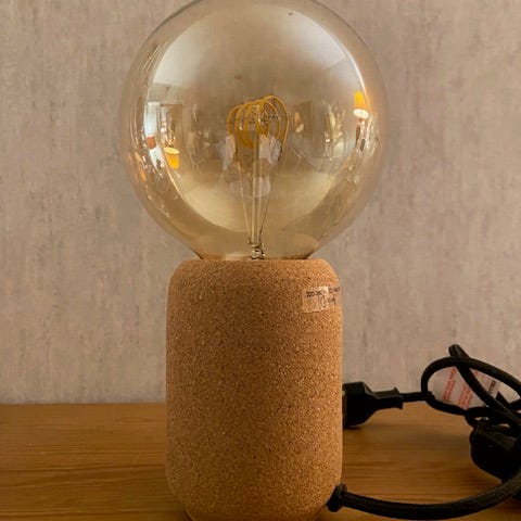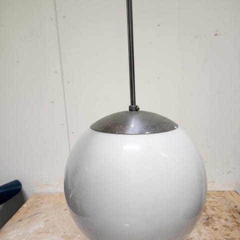 Ljus, grå/beige armatur av porslin med 150 mm opalvit glob, köpt på Byggfabriken.