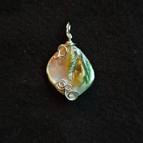 Hänge av grön snäckpärla med silverpläterad ståltråd. Perfekt att använda till halsband. Ca 2 cm i diameter.