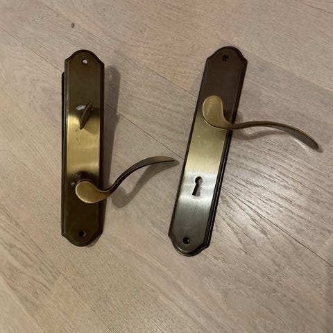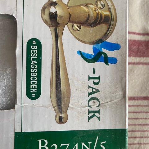 Handtagen är av traditionell design med två fästen per handtag. Finns på Östermalm. Kan skickas. Totalt 350 kr för alla 10 handtagen eller 40 kr/st.