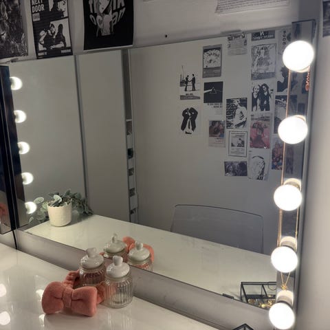 IKEA rund spegel med lampor. Använt som sminkspegel. Hängs upp med krok & koppas direkt i vägguttag